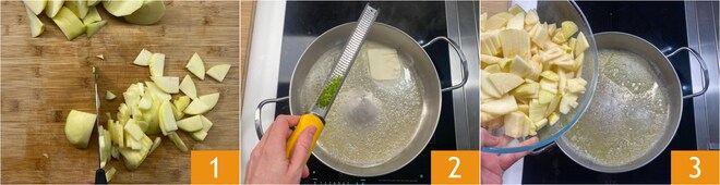 Para preparar os quadradinhos de massa folhada com maçã, em primeiro lugar, limpe as maçãs. Retire o miolo e corte-as em fatias bem finas 1. Em uma panela, derreta a manteiga e adicione a casca de limão 2 e as maçãs 3.