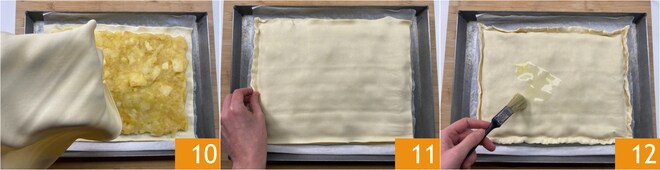 Sobreponha uma segunda folha de massa 10 e sele bem as bordas 11. Pincele com a manteiga derretida 12.