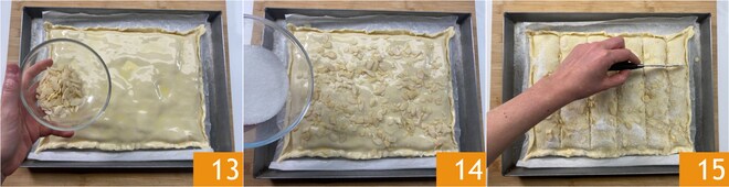 Polvilhe a superfície primeiro com as lâminas de amêndoas 13 e depois com o açúcar 14. Com a faca, aplicando uma pressão suficiente para marcar a massa superior e o recheio, mas não a massa inferior, faça linhas na superfície da massa: 4 no lado curto e 6 no lado longo 15. Desta forma, você formará os quadradinhos.