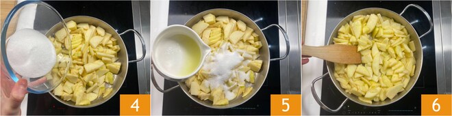 Junte o açúcar 4, o suco de limão 5 e misture 6. Cozinhe em fogo médio-baixo, mexendo frequentemente, por 10 minutos. Deve se formar um xarope que vai se engrossando e caramelizando, enquanto as maçãs se desmancham e adquirem a consistência de uma compota. Uma vez pronta, deixe esfriar completamente.