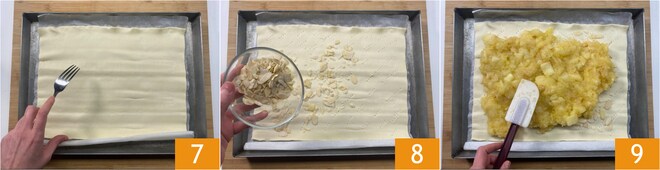 Em uma assadeira forrada com papel manteiga, coloque a massa folhada e fure-a com os dentes de um garfo 7. Distribua na superfície as lâminas de amêndoas 8 que enriquecerão o recheio e protegerão em parte a massa da umidade do recheio. Deite a compota de maçãs 9 e distribua por toda a superfície até 2 cm das bordas.