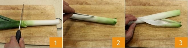 Para preparar a quiche com vieiras e alho-poró, comece limpando os alhos-porós. Elimine a parte verde 1, faça um corte na superfície com a lâmina de uma faquinha 2, remova a camada externa 3 e, por fim, corte em rodelas finas 4.