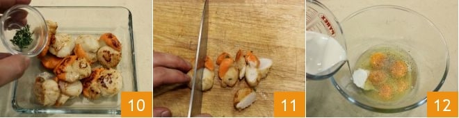 Terminada a cocção, deixe os moluscos esfriarem em uma tigela e tempere-os adicionando tomilho 10. Depois de cortar grosseiramente as vieiras 11, reserve-as. Em uma tigela, coloque os quatro ovos e a gema, o sal, a pimenta e o creme de leite fresco 12.