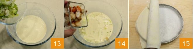 Agora adicione ao composto líquido os alhos-porós 13 e os moluscos 14. Forre com papel manteiga uma forma de 28 cm de diâmetro e desenrole a massa folhada, fazendo-a aderir bem ao fundo 15.