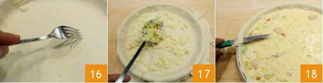 Fure a massa folhada com os dentes de um garfo 16. Agora você pode rechear a massa: distribua o Emmentaler ralado no fundo e despeje o composto de creme de leite, ovos, alhos-porós e vieiras 17. Corte com uma faquinha o excesso de massa, aparando a borda da forma 18.