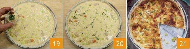Distribua na superfície uma pitada adicional de tomilho 19 e leve ao forno a quiche finalizada 20 em forno estático preaquecido a 180°C por cerca de 35 minutos (forno ventilado a 160°C por cerca de 25 minutos). Uma vez cozida, retire do forno sua quiche com vieiras e alho-poró e deixe esfriar antes de servir 21.