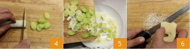 Depois de derreter em uma frigideira antiaderente metade da quantidade de manteiga com um pouco de óleo, refogue em fogo baixo as rodelas de alho-poró por cerca de 15 minutos até que fiquem bem macias 5. Terminada a cocção, reserve os alhos-porós e proceda ralando o Emmentaler; reserve também este 6