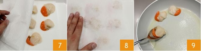 Agora você pode preparar as vieiras. Coloque-as em uma assadeira e cubra-as com uma folha de papel toalha 7, pressione-o delicadamente para secar a água em excesso 8. Derreta a manteiga restante na frigideira onde cozinhou os alhos-porós e doure as vieiras por poucos minutos, virando-as com uma colher de pau de vez em quando 9; ajuste o sal.