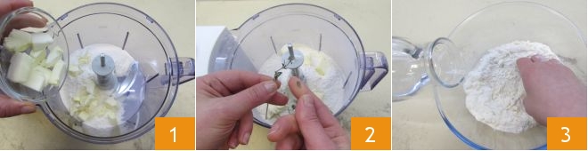 Para preparar a quiche de aspargos e mortadela, comece com a Massa brisée. Coloque em um processador de alimentos com lâminas a farinha peneirada junto com a manteiga fria em pedaços 1; adicione uma pitada de sal e triture tudo até obter uma mistura com aspecto arenoso e farináceo. Neste ponto, aromatize a massa com folhinhas de tomilho 2 e amasse tudo rapidamente, adicionando aos poucos a água fria 3.