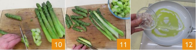 Corte ao meio no sentido do comprimento 3-4 aspargos, eles serão usados para a decoração. Corte o restante em rodelas finas 10, reservando as pontas que serão usadas também para a decoração final 11. Pique finamente a cebola chalota e deixe-a murchar lentamente em uma frigideira antiaderente com o óleo 12.