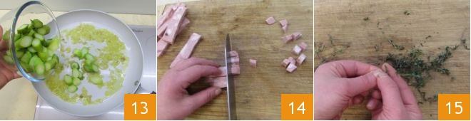 Cozinhe os aspargos em rodelas junto com a chalota, deixando apurar por 3-4 minutos 13. Enquanto isso, corte a mortadela em cubos 14 e separe as folhas de tomilho 15.