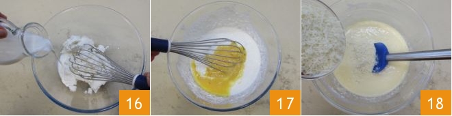 Em um recipiente, trabalhe a ricota e o leite com a ajuda de batedores 16, depois adicione os ovos previamente batidos 17 e o queijo ralado 18.