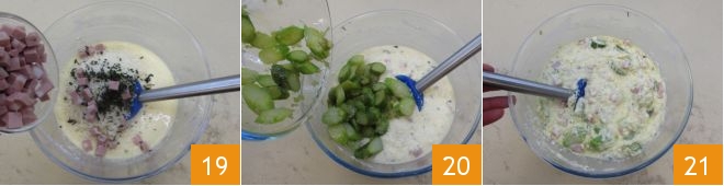 Insira no recheio também a mortadela em cubos 19 e os aspargos já frios 20; misture com uma espátula até obter uma mistura homogênea 21 e ajuste o sal e a pimenta.