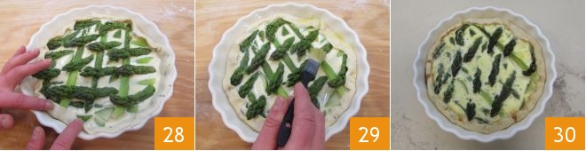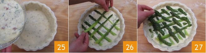 Despeje o recheio 25, nivele bem com uma espátula e decore a superfície com os aspargos restantes cortados ao meio no sentido do comprimento, criando um motivo losangulado 26. Termine a decoração inserindo as pontas dos aspargos que você reservou, distribuindo-as a gosto 27.