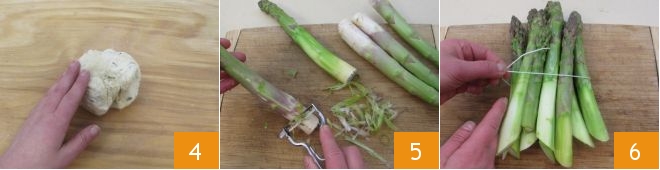 Quando a massa estiver compacta e elástica 4, envolva-a em filme plástico e deixe descansar na geladeira por pelo menos 40 minutos. Enquanto isso, dedique-se ao recheio: Como limpar os aspargos 5, lavando-os sob água corrente fresca e descascando-os com um descascador, depois amarre-os com barbante de cozinha 6.