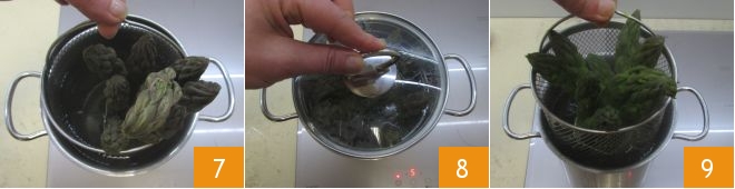 Coloque uma panela no fogo e cozinhe-os em água fria salgada por cerca de 15 minutos, preferencialmente usando uma panela alta para aspargos 7 e cobrindo com uma tampa, depois escorra-os e deixe esfriar um pouco 9.
