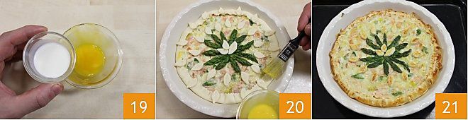 Então bata o leite com uma gema 19 e pincele a massa brisée para deixá-la brilhante 20 e asse em forno já aquecido a 190° por 25-30 minutos (170 graus por 20 minutos em forno ventilado), até que a massa brisée esteja bem dourada e crocante 21. Retire a quiche, deixe-a descansar por 5 minutos e depois corte e sirva quente ou morna.
