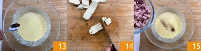 Adicione uma pitada de noz-moscada 13. Corte a provolone em cubos 14. Em seguida, adicione à mistura de ovos primeiro o presunto em cubos 15