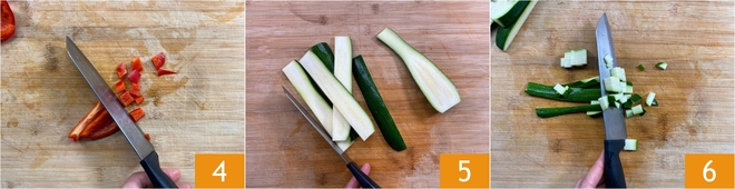 Destes, corte cubos do mesmo tamanho das cenouras 4. Agora corte as extremidades das abobrinhas e corte-as primeiro em fatias 5 e depois em cubos grandes também de 1 cm 6.