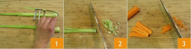 Para preparar o ragu de pato, começamos pelo Caldo de legumes: mantenha-o quente. Depois, passe para a picagem dos vegetais. Remova os fios do aipo com o descascador de batatas, ou uma lâmina lisa, 1 e depois pique 2. Continue limpando e cortando as cenouras 3