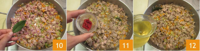 Adicione o louro 10, o extrato de tomate e deixe evaporar com o vinho 12.