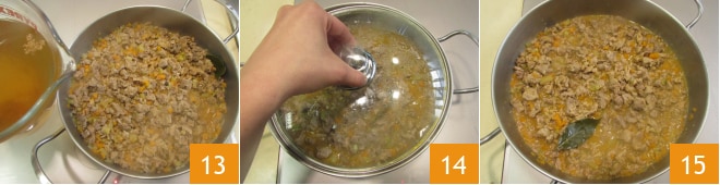 Quando a parte alcoólica tiver evaporado, molhe com o caldo de legumes quente 13. Ajuste o sal e a pimenta, cubra com a tampa e cozinhe em fogo baixo por cerca de 70 minutos: lembre-se de mexer de vez em quando e adicionar mais caldo conforme necessário 14. Uma vez pronto o ragu de pato, é só servir e saborear 15!