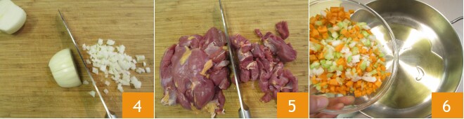 e a cebola 4. Por fim, pique a carne de pato em cubos não muito pequenos 5. Vá para o fogão. Em uma panela com um pouco de óleo, refogue os vegetais picados por alguns minutos 6.