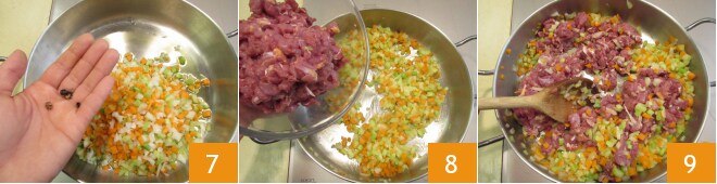 Adicione as bagas de zimbro esmagadas com o dorso de uma faca 7 e acrescente a carne de pato, selando por mais alguns minutos 8, mexendo de vez em quando 9.
