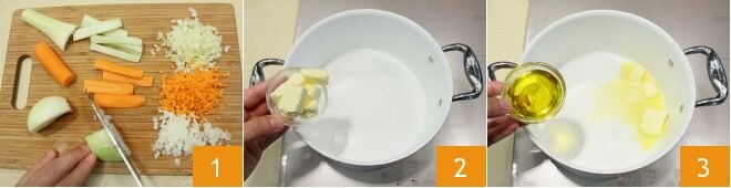 Para preparar o ragu de porco, prepare o Caldo de carne. Em seguida, passe para o refogado: limpe e pique finamente a cenoura, aipo e cebola 1. Em uma panela, coloque a manteiga 2 e derreta em fogo bem baixo, depois adicione o óleo 3 e aqueça por alguns instantes.