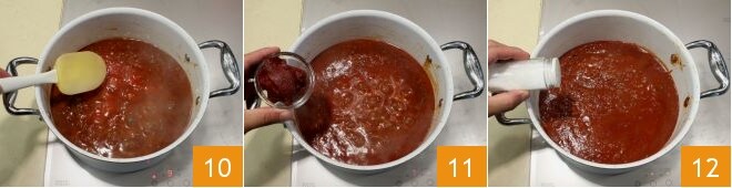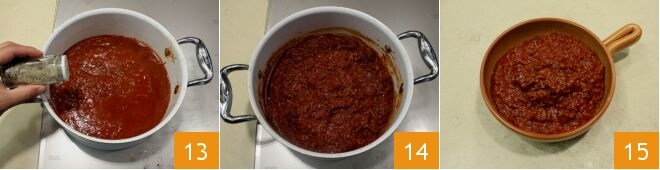 misture 10 e deixe apurar por alguns minutos. Quando o ragú voltar a ferver, adicione também o extrato de tomate 11, misture ao ragú, adicione sal 12