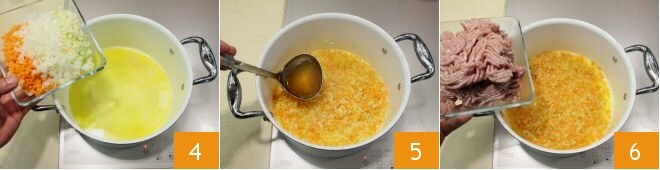 Em seguida, adicione os legumes picados finamente 4. Refogue e doure a cebola, adicione 1-2 conchas de caldo de carne para favorecer o cozimento 5. Após cerca de 15 minutos, adicione a carne moída 6