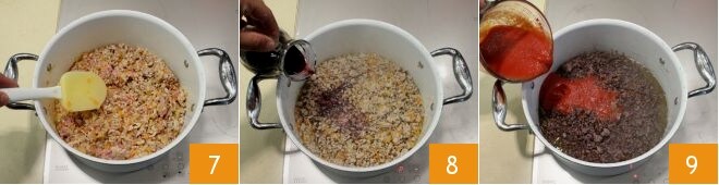 e deixe dourar bem por cerca de dez minutos, esfarelando-a com uma espátula 7 ou uma colher de pau. Adicione um pouco de caldo vegetal, depois acrescente o vinho tinto 8 e deixe evaporar em fogo moderado. Quando o vinho tiver evaporado, acrescente o molho de tomate 9,