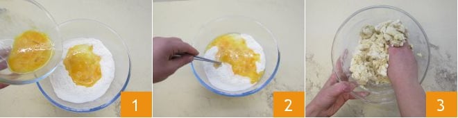 Para preparar os ravioli de cotechino com molho de lentilhas, comece fazendo a Massa fresca de ovo (massa e formatos): coloque as farinhas peneiradas em uma tigela e no centro despeje os ovos 1 e uma pitada de sal. Em seguida, comece a trabalhar os ingredientes misturando com um garfo 2, ampliando sempre mais para pegar a farinha. Depois, comece a trabalhar com as mãos 3 por pelo menos 10 minutos,