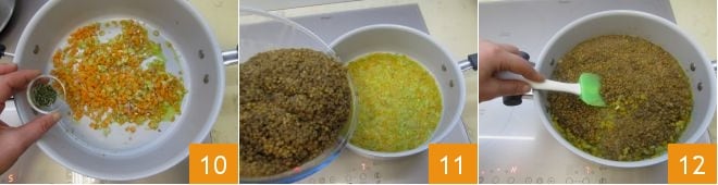 Adicione também o alecrim 10 e misture com uma espátula. Junte as lentilhas 11 e cubra a panela com uma tampa, deixando cozinhar em fogo baixo por cerca de 10 minutos. Mexa frequentemente para garantir que não sequem demais 12 e