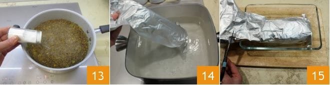 ajuste o sal 13 e a pimenta. Quando estiverem prontas, desligue o fogo e proceda com o cozimento do cotechino: pegue um cotechino pré-cozido e coloque-o em uma panela com água fria; acenda o fogo e deixe ferver conforme as instruções na embalagem (levará cerca de 15 minutos) 14. Após o tempo necessário, escorra e coloque-o em uma tigelinha para retirar o invólucro externo 15, tomando cuidado para não se queimar com o líquido presente na embalagem.