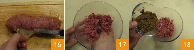 Retire a pele do cotechino 16, depois pique-o finamente com uma faca em uma tigela 17. Adicione 50 g das lentilhas que você preparou à carne 18 e misture com uma espátula: o seu recheio está pronto.