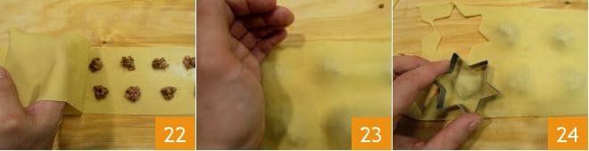 depois, sobreponha outra folha do mesmo tamanho 22; faça uma leve pressão para retirar todo o ar retido entre as duas folhas 23. Com um cortador de biscoitos em forma de estrela, corte seus ravioli 24, repetindo a operação até esgotar os ingredientes e amassando novamente as sobras: com nossas doses, você deverá obter 40 ravioli.