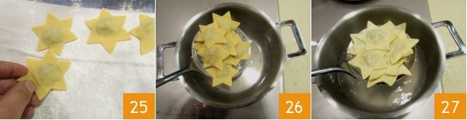 à medida que os faz, coloque-os sobre um pano enfarinhado 25. Coloque no fogo uma panela com bastante água para preparar o Caldo de legumes. Cozinhe os ravioli em água fervente salgada por cerca de 4-5 minutos 26, depois escorra-os 27.