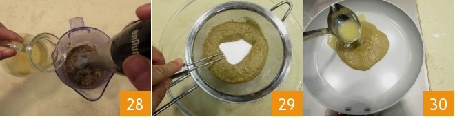 Enquanto isso, transfira para um recipiente alto as lentilhas restantes que você cozinhou. Bata com um mixer de imersão, adicionando lentamente 50 g de caldo 28. Quando o molho atingir a consistência desejada, coe com uma peneira para torná-lo mais homogêneo 29. Em uma frigideira antiaderente, aqueça o molho de lentilhas junto com o caldo que sobrou 30, depois