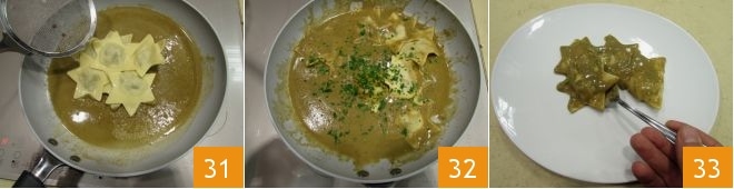 adicione os ravioli 31 e salteie por alguns segundos. Ao final do cozimento, desligue e adicione a salsa picada 32. Seus ravioli de cotechino com molho de lentilhas estão prontos para serem saboreados e servidos 33.