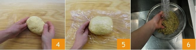 manuseando e batendo a massa sobre a bancada até obter uma mistura macia e homogênea 4. Forme um bloco e enrole-o com filme plástico 5, depois deixe descansar em temperatura ambiente por cerca de 30 minutos. Enquanto isso, continue com a preparação do molho: primeiro, lave as lentilhas em água corrente 6;