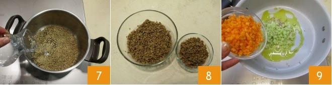 coloque-as dentro de uma panela de pressão, despeje água de modo que as cubra totalmente 7. Feche a panela e cozinhe por 20 minutos e depois deixe esfriar 8. Em uma panela antiaderente, doure em fogo baixo o óleo com a cebola, o alho, o aipo e a cenoura picados finamente 9.