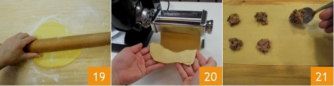 Neste ponto, pegue o bloco de massa de ovo e coloque-o sobre a bancada ligeiramente enfarinhada. Estenda-o com o rolo 19, divida-o e faça 8 folhas de 60x40, o mais finas possível, utilizando uma máquina de macarrão 20. Disponha sobre a folha uma colher de chá (cerca de 5 g) do recheio que você preparou 21, deixando cerca de 3-4 cm entre uma colherada de massa e outra;