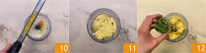 Tempere com as raspas de limão 10 e processe até obter uma mistura homogênea 11. Adicione também a manjerona.