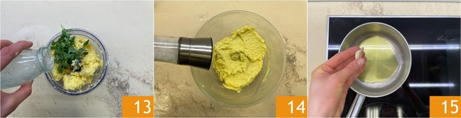 Se parecer muito compacto, adicione um pouco de água 13, depois salgue 14 e transfira a mistura para um saco de confeitar sem bico. Deixe o recheio descansar na geladeira por 30 minutos. Cuide do molho: em uma panela, doure o dente de alho com o óleo 15.