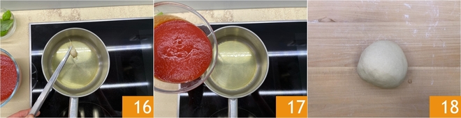 Retire o alho e adicione o purê de tomates, tempere com uma pitada de sal, deixando cozinhar por cerca de 15 minutos em fogo baixo. Enquanto isso, pegue a massa novamente 18.
