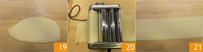 Retire uma porção e estenda-a com o rolo para achatá-la 19, depois passe-a nos rolos da máquina de macarrão começando pela espessura mais larga 20 até obter uma folha com espessura de 1 mm 21.
