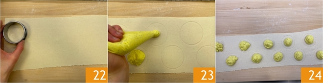 Com um cortador de massa de 6 centímetros (com a parte cortante voltada para cima), pressione levemente a folha para obter círculos que irão guiá-lo de forma mais prática na composição 22. No centro desses círculos, esprema porções do recheio 23 24.