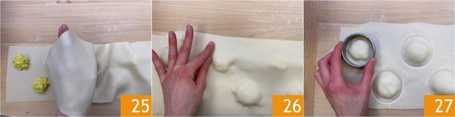 Cubra com outra folha da mesma medida 25 e pressione a massa ao redor do recheio para retirar o ar 26, depois sele-os sempre com o mesmo cortador de massa 27.
