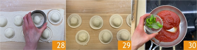 Agora corte os raviolis com um cortador de massa ondulado de 8 cm 28; com essas quantidades, você obterá cerca de 24 raviolis 29. Agora despeje o molho cozido em uma frigideira ampla e perfume com o manjericão fresco 39.